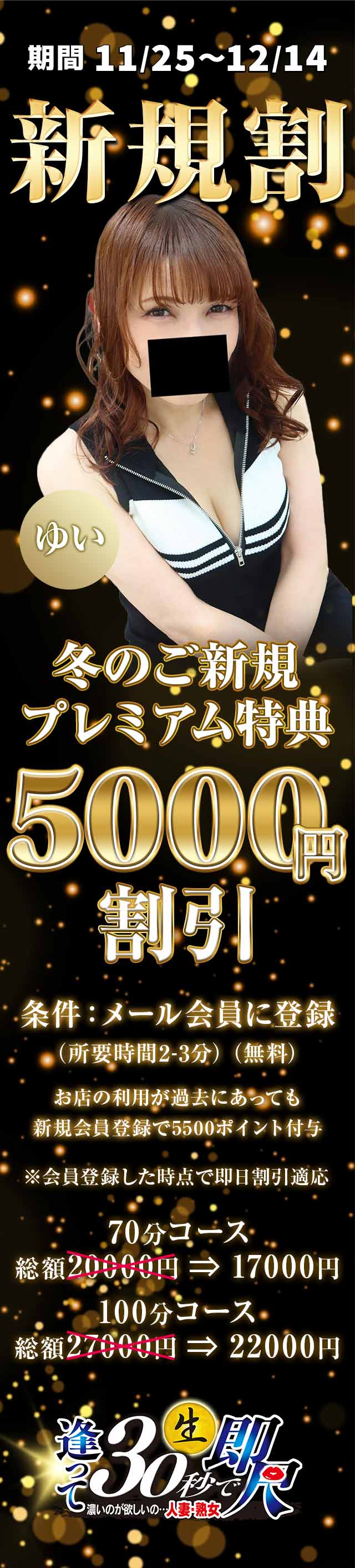 【冬のご新規プレミアム特典】 最大で5000円割引のプレゼント 70分総額20000円⇒17000円 100分総額27000円⇒22000円 オフィシャル会員登録(無料)(所要時間2~3分)していただいたお客様へ5500ポイント付与させて頂きます。 ※お店の利用があっても会員登録で割引 即日利用可能なので、この機会に是非淫乱な人妻の即尺を体験しにきてください!
